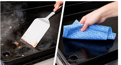 Basta versare una piccola quantità di acqua a temperatura ambiente sulla piastra ancora calda e rimuovere avanzi di cibo. Successivamente, con l’aiuto della spatola, spostare il residuo di cibo nel bicchiere grasso.