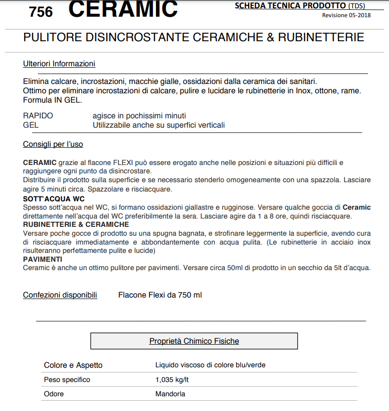 CERAMIC è un disincrostante che elimina calcare, incrostazioni, macchie gialle e ossidazioni dalla