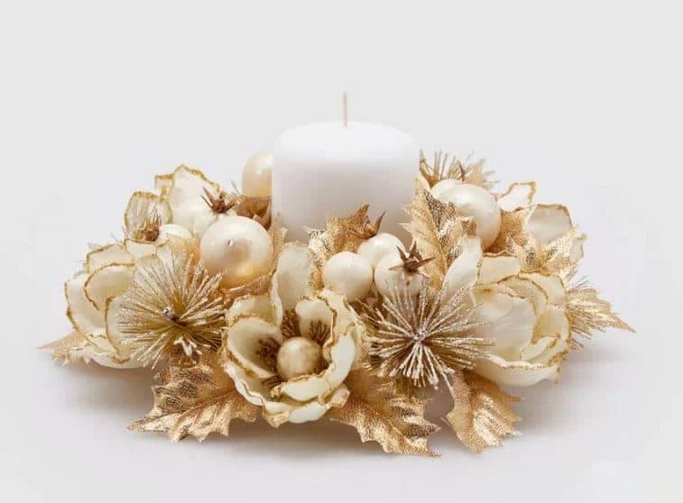 Decorazione natalizia a marchio Enzo de Gasperi costituita da una candela bianca circondata da una corona dimelograni e magnolie gold.