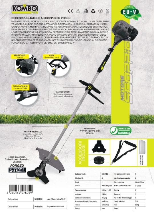 Il decespugliatore professionale a scoppio KOMBO PRO EU V 33CC modello BC330 si presenta come uno strumento robusto e performante, progettato per affrontare anche le erbe più tenaci e i lavori di giardinaggio più impegnativi.