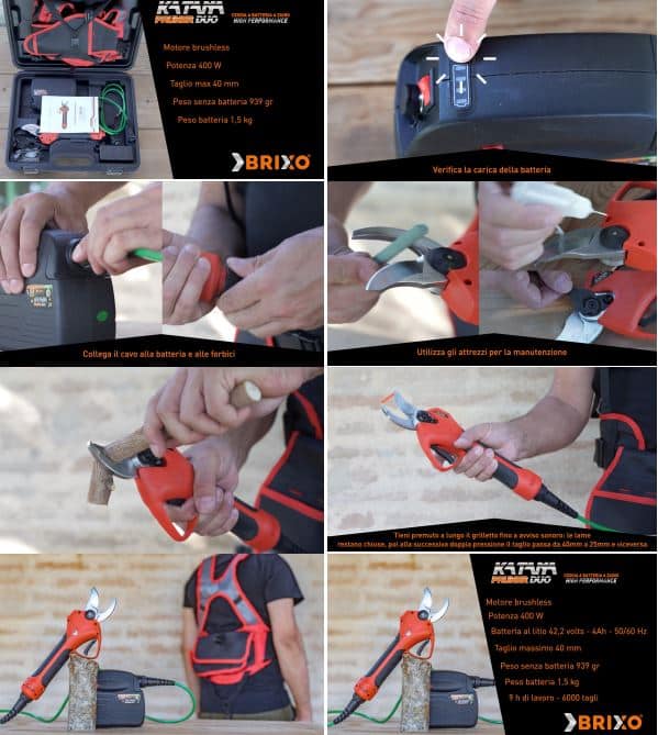 La durata della batteria é di circa 9 ore, con un tempo di ricarica molto veloce. Il trasporto delle forbici e della batteria è facilitato da uno zaino in dotazione. Il peso delle forbici di solo 0,850 kg garantisce un utilizzo privo di sforzi eccessivi. A seconda della tipologia di impianto su cui si deve lavorare, uliveto, frutteto o vigna, le forbici KATANA PRUNER DUO sono una scelta che vi garantirà affidabilità e prestazioni professionali.