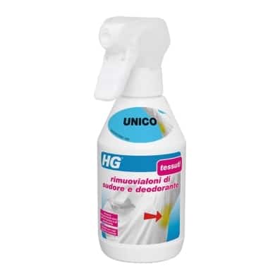 HG rimuovialoni di sudore e deodorante è il pretrattamento più efficace per rimuovere aloni gialli dai tessuti causati da sudore o deodorante. Non è possibile rimuovere questo tipo di aloni gialli ostinati con detersivi ordinari o rimuovimacchie ma lo è con HG rimuovialoni di sudore e deodorante. HG rimuovialoni di sudore e deodorante è indicato per capi sia bianchi che colorati. Utilizzando questo rimuovialoni in ogni ciclo di lavaggio si evita anche la formazione di aloni gialli.