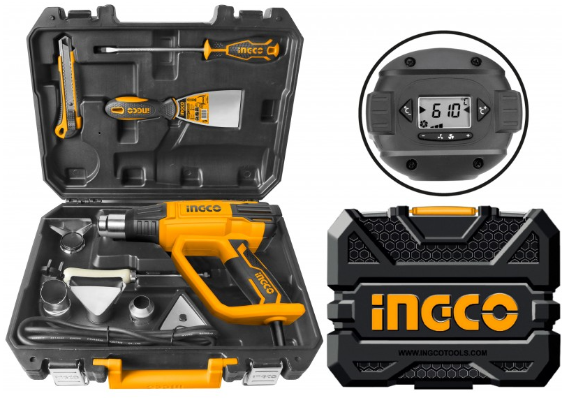 Termosoffiatore professionale con temperatura regolabile. Il termosoffiatore è dotato di un raschietto per facilitare l’eliminazione di adesivi o vernice e 4 tipi di ugelli per la regolazione del flusso d’aria.