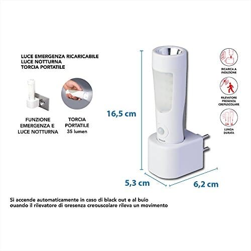 Lampada portatile, luce di emergenza e luce notturna Genialux 14 + 6 LED, 50 + 35 lm. Funziona senza fili e si ricarica ad induzione tramite la base, con rilevatore di presenza (distanza rilevamento 3 m) e sensore crepuscolare 230V~. Alimentazione con batteria al litio Li-ion 3 ,7 V 650 mAh, autonomia massima 3,5 ore (14 LED frontali) e 8 ore (6 LED superiori). Tempo di ricarica 6 ore circa. Provvista di interruttore per disattivare il sensore di movimento crepuscolare quando la lampada è inserita nella base di ricarica e per selezionare le 3 funzioni di torcia portatile: 14 LED frontali, 6 LED superiori e OFF. Posizionata nella base di ricarica si accende automaticamente (14 LED frontali) in caso di black-out, per poi spegnersi al ripristino dell’energia elettrica. E’ inoltre punto luce notturno segna passo: in condizioni di scarsa luminosità si accende per circa 20 secondi (14 LED frontali) quando rileva movimento. Estraendola dalla base di alimentazione è utilizzabile come pratica torcia portatile. E’ leggera, maneggevole, tascabile ed efficace in caso di emergenza, l’ideale in casa, in ufficio, in negozi ecc..