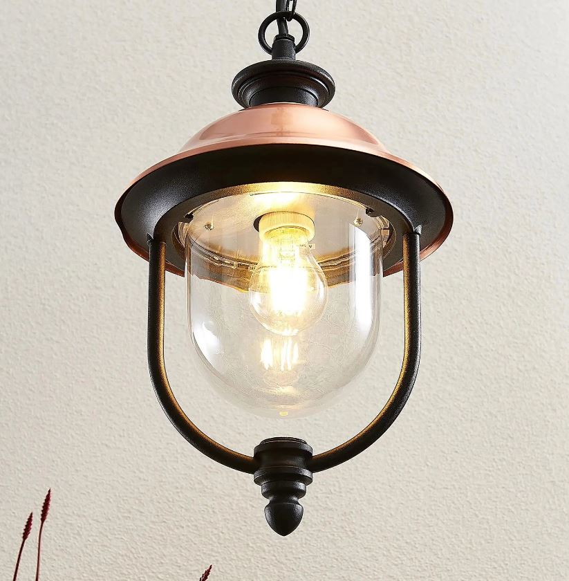 In alluminio pressofuso, copertura finitura ramata schermo termoplastico trasparente. Attacco E27 – IP44. Dimensioni Ø25xH47 cm. + catena 50 cm.