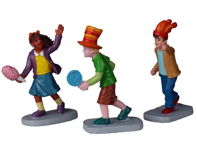 Questo set di personaggi raffigura un trio di bambini che si divertono con cappellini da festa e dolcetti grandi quanto la loro testa! Sembrano spensierati e felici, proprio come dovrebbero essere!