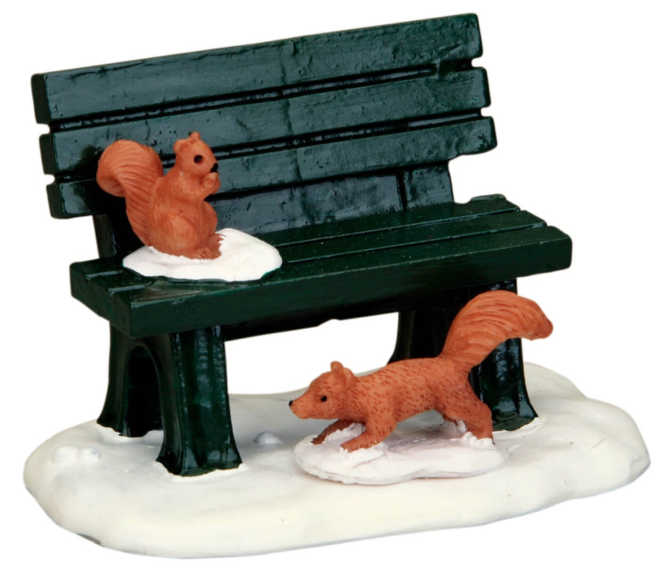 Bellissima riproduzione di una panchina innevata con scoiattoli, ideale per decorare il tuo paesaggio natalizio.