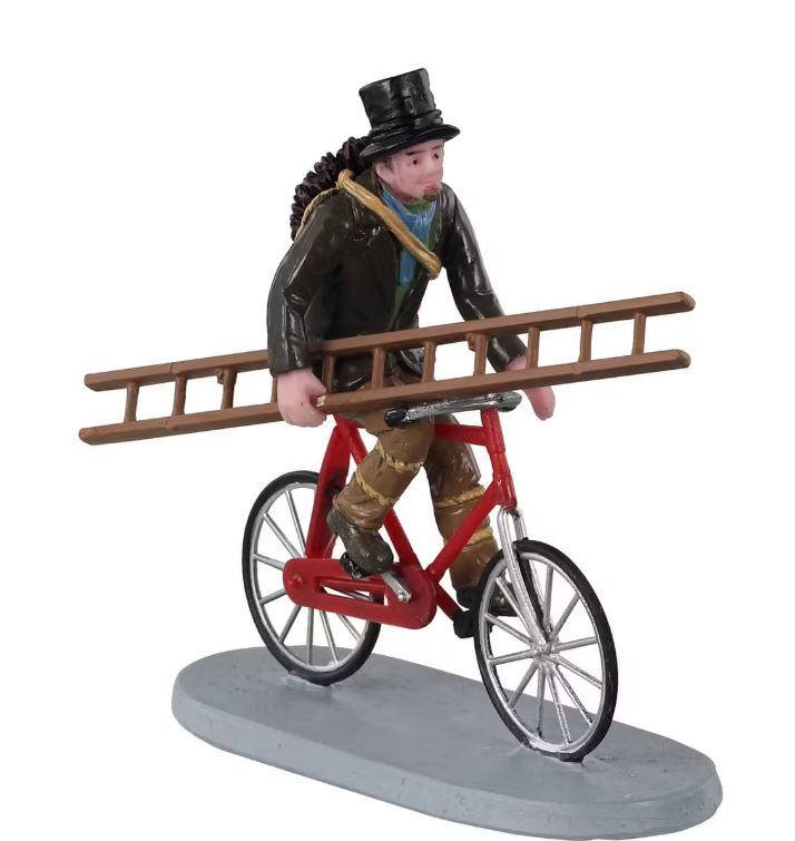 Questa statuina del villaggio natalizio Lemax raffigura uno spazzacamino che gira su una bicicletta rossa.