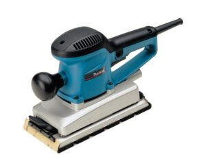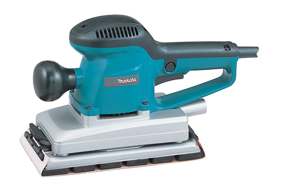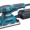 Levigatrice orbitale 115x229mm per legno e metallo con velocità fissa (10.000 orbite/min), ampia orbita da 2,6mm, base velcro e sacchetto aspirazione.