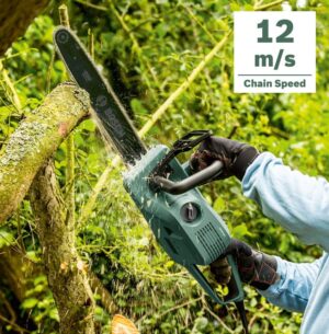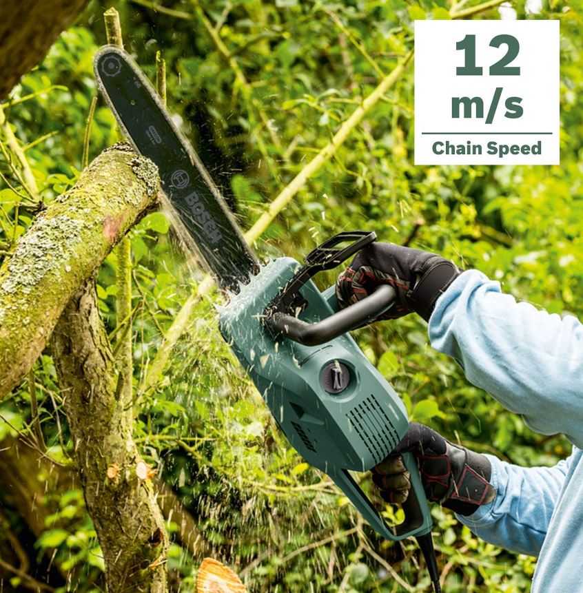 Questo elettroutensile eroga una velocità della catena di 12 m/s e barra di 35 cm, assicurando un taglio rapido ed agevole anche su ceppi di legna di grosse dimensioni, grossi rami o piccoli alberi.