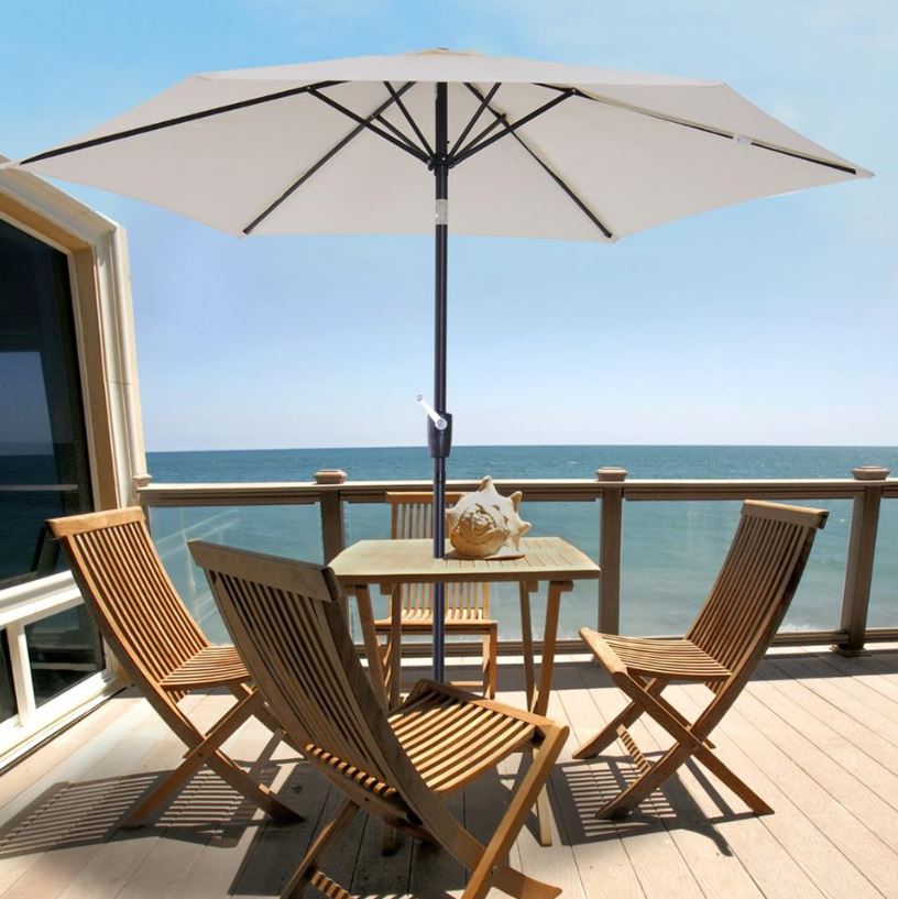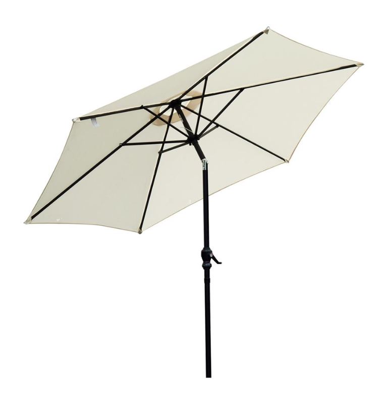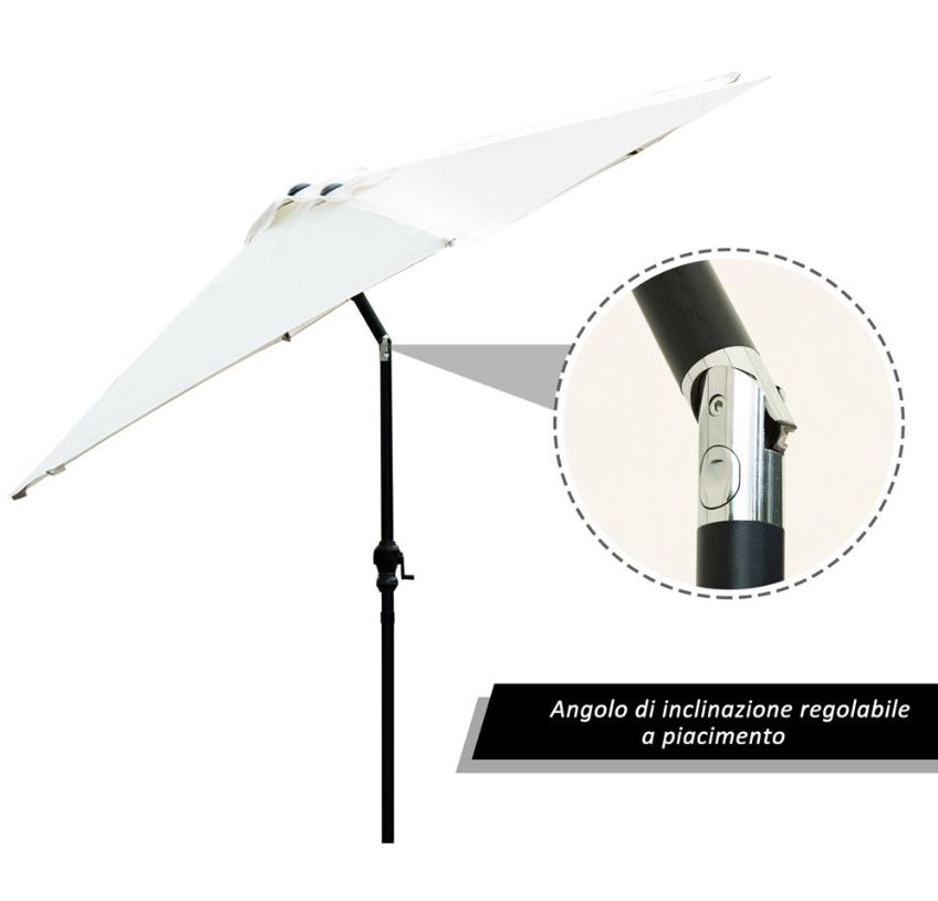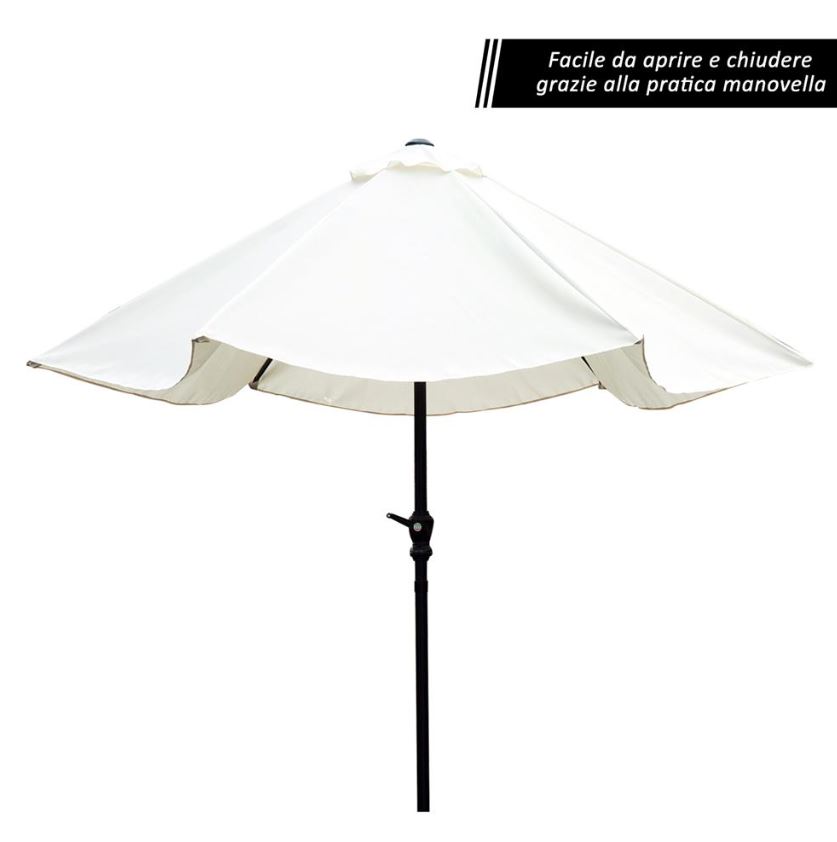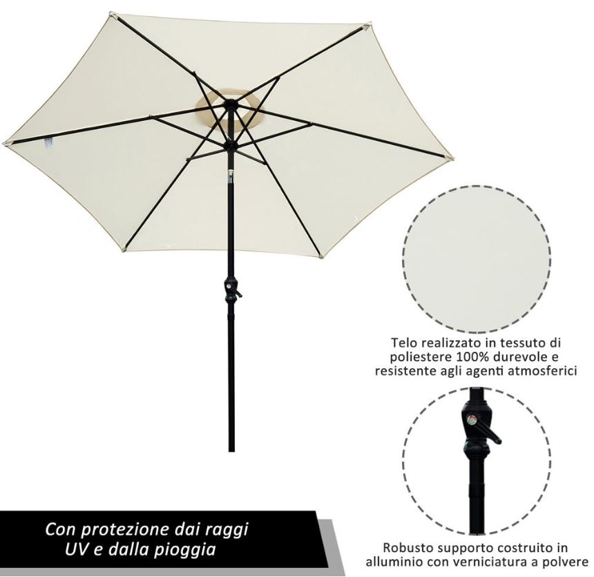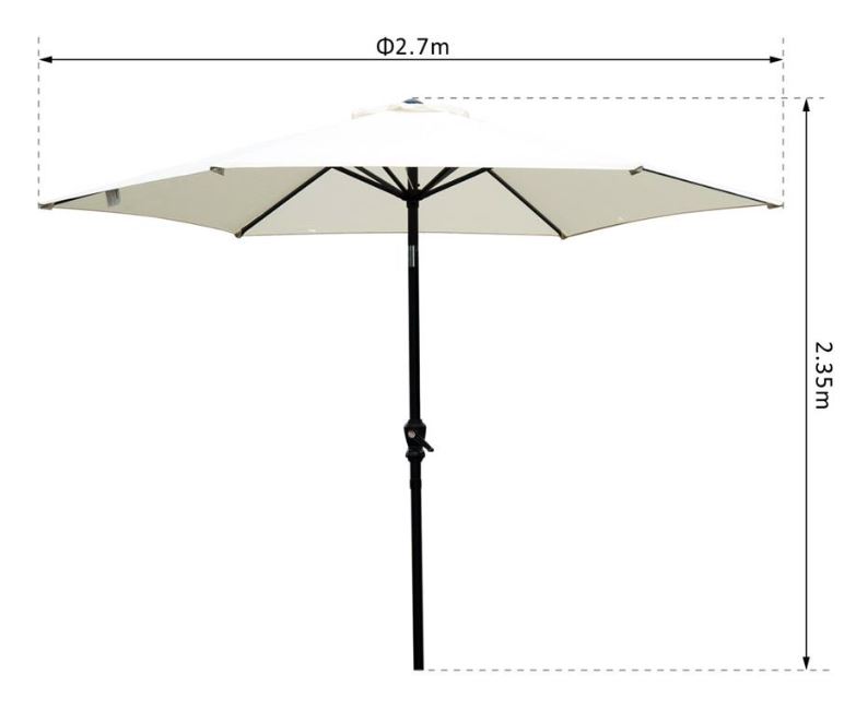 L’ombrellone è montato su un palo di metallo verniciato a polvere resistente all’acqua con un diametro di 270 cm.