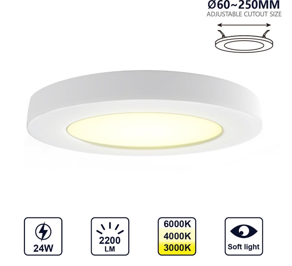 Adattabile a foro incasso da 60 a 250 mm. Questo pannello led, grazie alla sua particolare staffa e mollette di fissaggio, può essere installato in fori già predisposti con dimensioni da 60 a 250 mm.