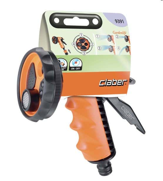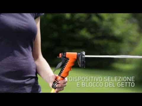 Lancia a pistola multi getto con comoda impugnatura ergonomica. Ruotando la testa della pistola si ottengono getti diversi: da diffuso a concentrato, annaffiatoio, doccia e aeratore (il getto d’acqua è miscelato con piccole perle d’aria). Quest’ultimo è utilissimo per bagnare le piante in vaso senza sollevare schizzi d’acqua. Dispositivo di selezione e blocco del getto desiderato.