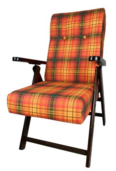 Sedia con braccioli dalla struttura in legno di faggio color noce, imbottita con tessuto fantasia scacchi blu. Dimensioni 40x50x110 cm.