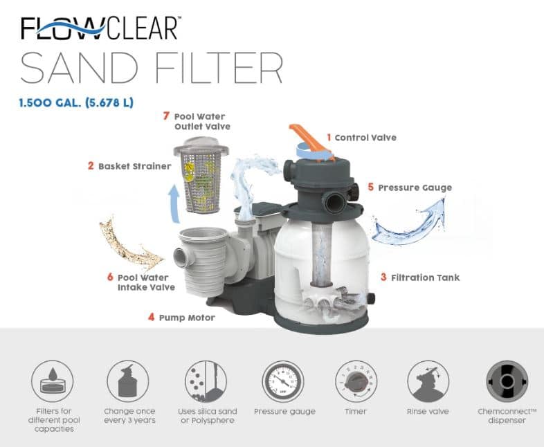 Una bella piscina richiede acqua pulita, quindi un filtro di qualità. Più efficiente delle pompe a filtro, un filtro a sabbia Flowclear è il sistema di filtrazione ideale per la piscina, sia per la semplicità d’utilizzo sia per l’efficacia della sua azione. I quattro modelli della gamma si differenziamo per portata d’acqua e sono compatibili con la maggior parte delle piscine Bestway esistenti sul mercato.