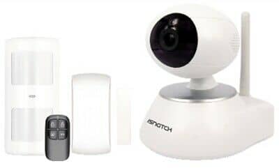 Kit con dotazione di 1 telecamera IP motorizzata da interni Wi-Fi o cablata RJ45 con risoluzione HD 720p da 1MP e sensori di allarme wireless di cui 1 rilevatore PIR in attivazione su presenze, 1 rilevatore magnetico di apertura porte/finestre e 1 radiocomando per armo/disarmo del sistema.