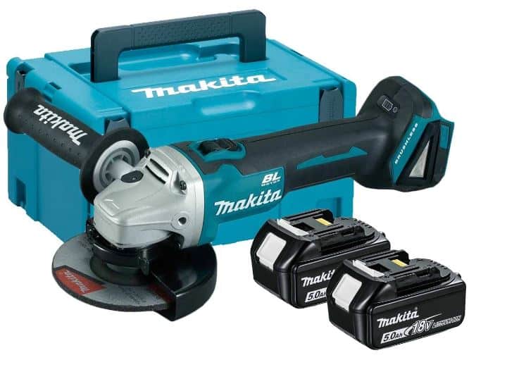 La smerigliatrice DGA513RTJ è fornita nella pratica valigetta Makpac, con due batterie BL1850b e un caricabatterie.