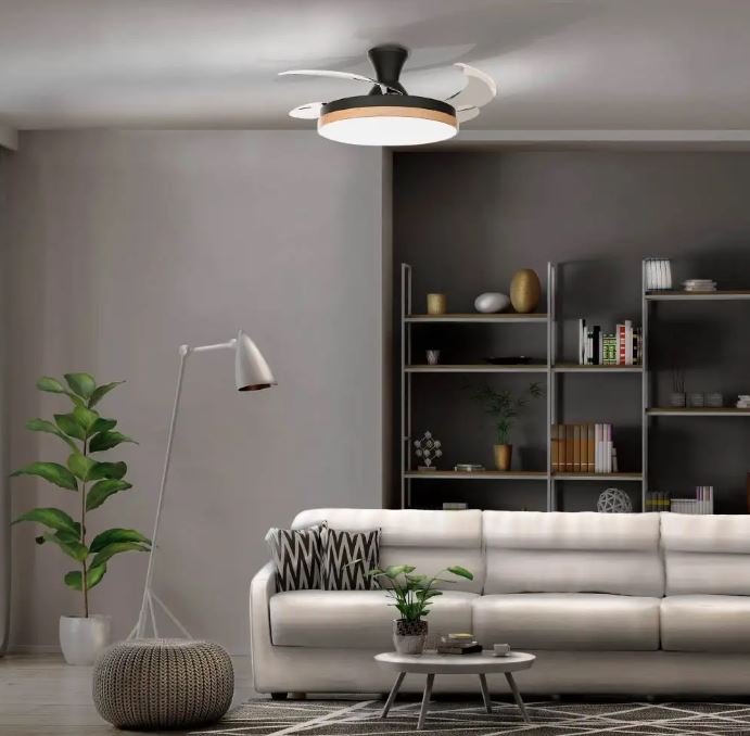 Ventilatore retrattile ALMA con luce LED integrata, elevato flusso luminoso e memoria della temperatura di colore.